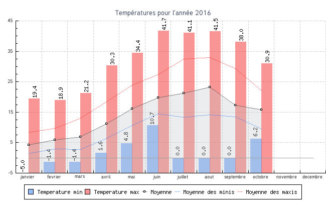 | juillet | 0.0 °C | 13.3 °C | 41.1 °C | 32.5 °C | 21.2 °C | 1.2 km/h | 23.4 km/h | NNO |